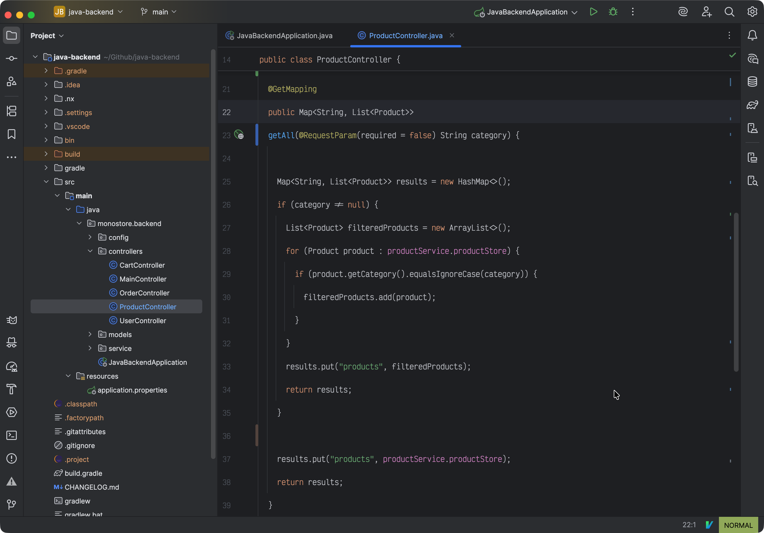 For starters, let's look at our Java backend. It's just a simple app built using the Spring Boot framework. With this, we can set up various rest endpoints for interacting with some data. There's some endpoints for user management, authentication, and session storage for logged in users. For Java developers, running and testing this app is as simple as pressing the "play" button in IntelliJ.