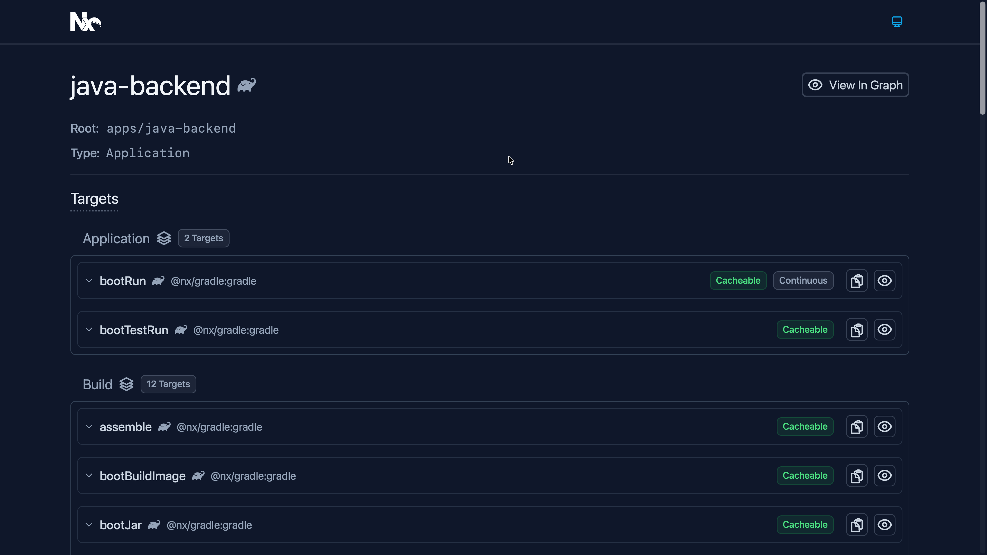 For our Java project, it's going to suggest that we include the @nx/gradle plugin as we are using Gradle as our build system. Once installed, we can run nx graph or nx show project java-backend to inspect.