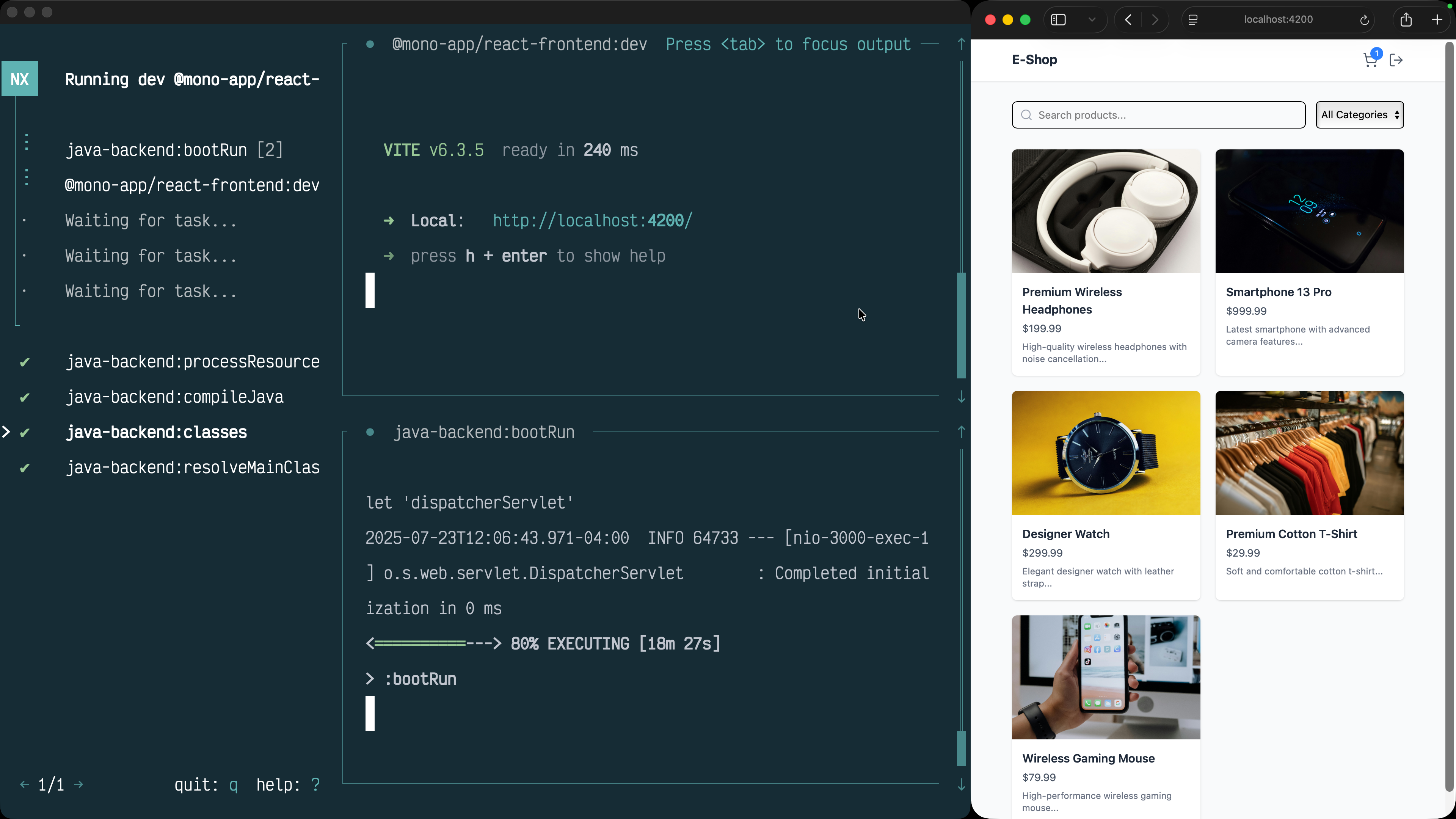 13Now we can run react-frontend:dev and we'll automatically get our Java backend up and running