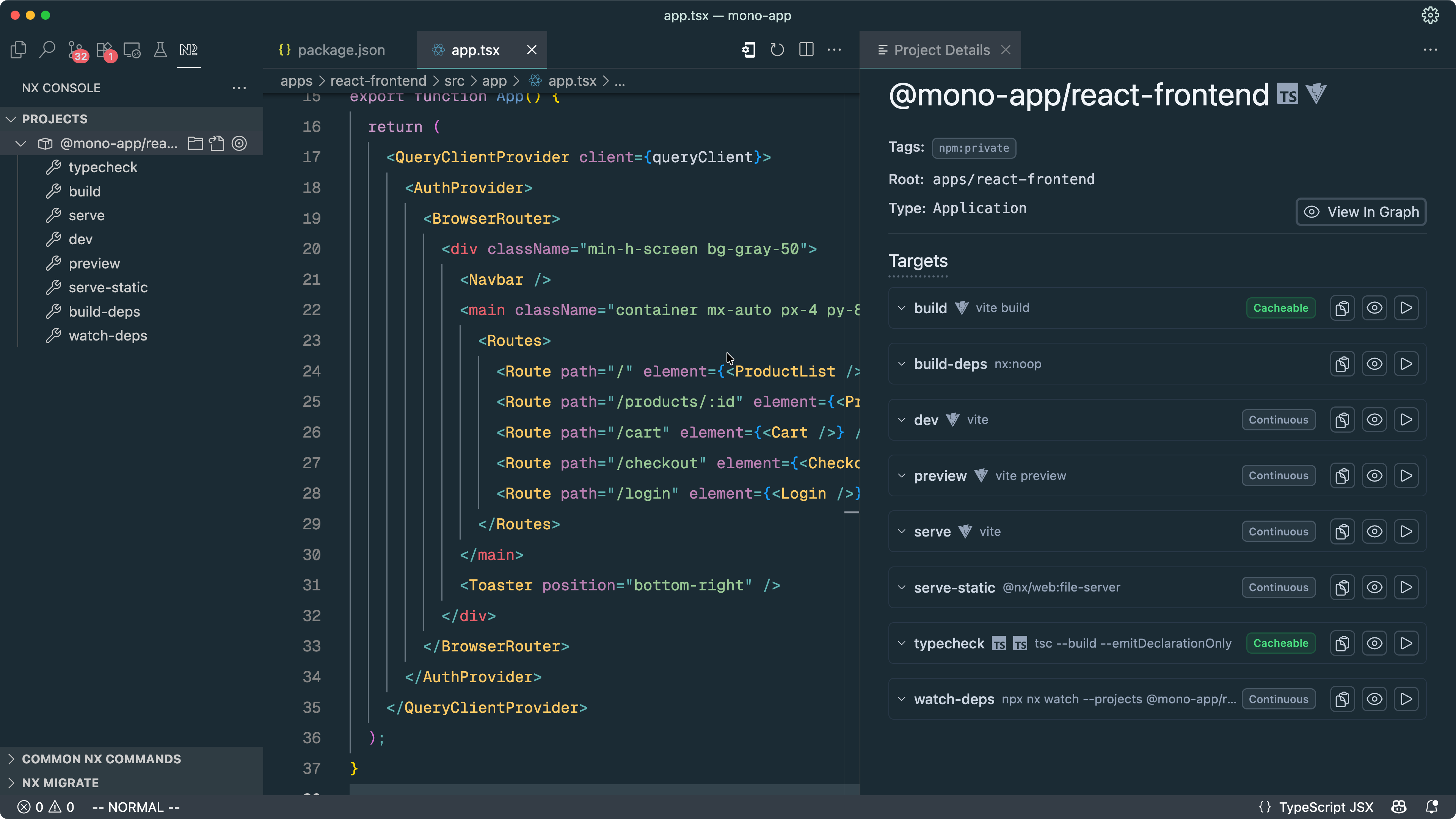 Our frontend project is just your standard React app. It already exists in a Nx workspace, so I have all of my usual Nx feature available to me. It interacts with the backend by making requests to it, but I need to start the two projects separately, which can just be cumbersome to manage.
